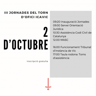 Un any més, en reivindicació del nostre sistema de justícia gratuïta i del paper dels advocats i advocades de Torn d’Ofici, l’ICAVIC portarà a terme la celebració del Dia de la Justícia Gratuïta i del Torn d’ofici, que s'inicia avui i acaba el proper 12 de juliol, amb la programació de diferents actes