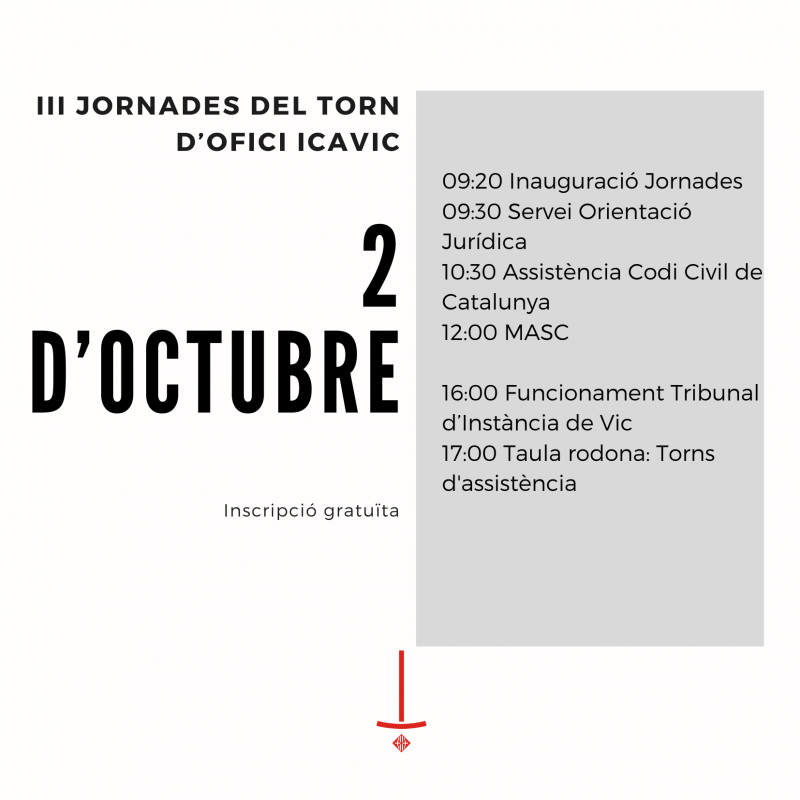 Us recomanem vivament l’assistència , ja que els temes que s’hi abordaran són d’interès general per a tots els col·legiats i col·legiades, independentment de si esteu inscrits al torn de defensa d’ofici.